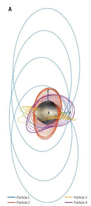 Orbite di alcune particelle emessa dalla superficie di Bennu (Crediti: Lauretta et al., Science 366, 2019)