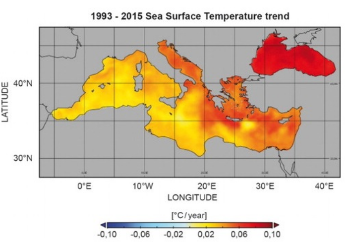 Nel 2015 la superficie del Mar Mediterraneo e del Mar Nero ha mostrato livelli di caldo anomali , in particolare nel Mediterraneo del Nord e nell’intero Mar Nero che hanno sperimentato una forte anomalia positiva fino a + 0.8°C), Mentre le anomalie lungo la costa libica erano vicine a zero. LO studio evidenzia che «Lo schema spaziale del trend SST nel periodo 1993-2015 è coerente con quello generale riscaldamento del pianeta e mostra un comportamento distinto tra le parti occidentali e orientali del Mar Mediterraneo. Infatti, la magnitudo del trend aumenta verso est, con minimi nel bacino occidentale e massimi nell’arco cretese e nel Mare Egeo settentrionale».