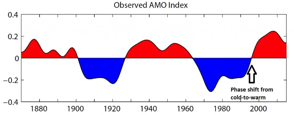 La Atlantic Multidecadal Oscillation, è un indice che misura le temperature superficiali delle acque dell’Oceano Atlantico: qualora fossero sopra la norma, l’indice si indica con AMO+, al contrario con AMO-.