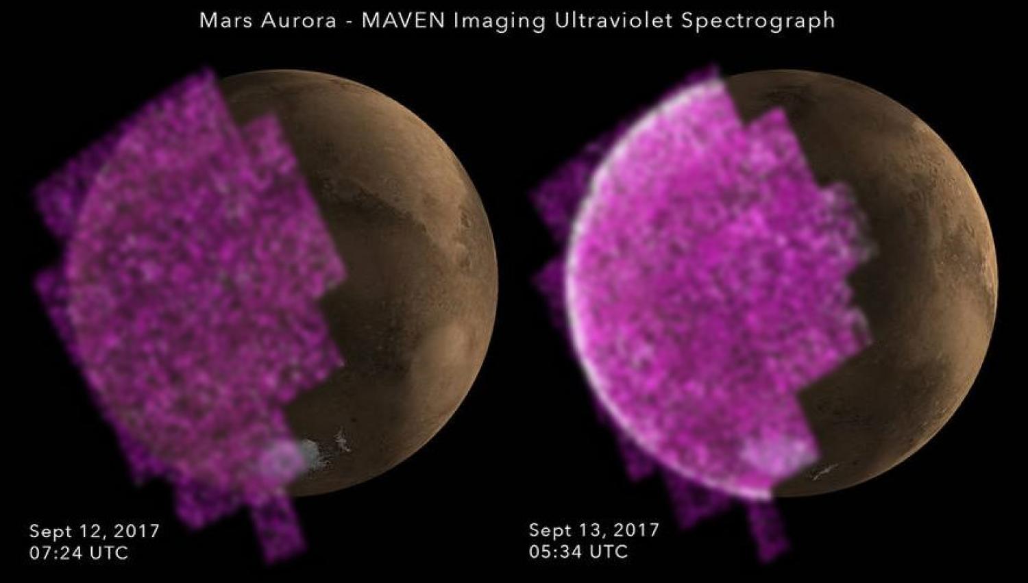 Sequenza ultravioletta sul lato notturno di Marte (il cui orientamento è mostrato a destra) – Credits: MAVEN/NASA/Univ. of Colorado