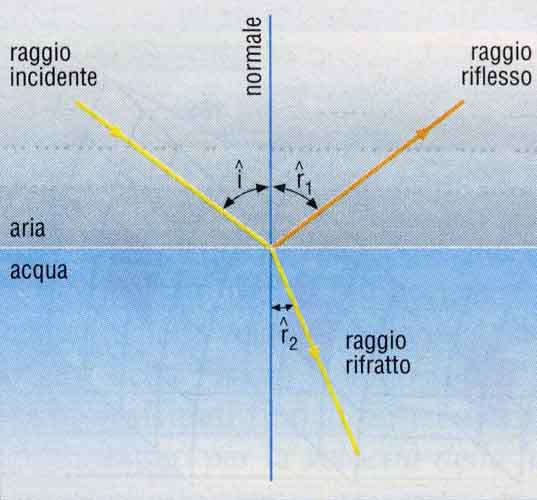 Chiamiamo raggio riflesso la frazione riflessa del fascio luminoso e raggio rifratto quella che invece prosegue all’interno del liquido. In generale questo fenomeno si verifica ogni volta che un raggio luminoso ** incide sulla superficie che separa due liquidi o un liquido da un gas. Si tratta di un comportamento molto comune e che ritroviamo anche in altre branche della fisica (specialmente nella meccanica quantistica).