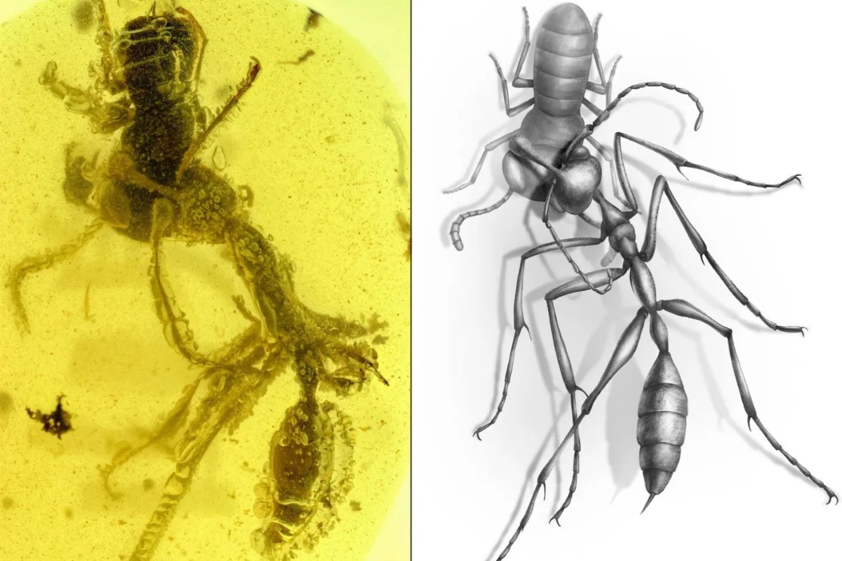 È stata definita “formica infernale” ma l’inferno ha travolto anche lei: i ricercatori hanno ritrovato uno straordinario fossile di circa 100 milioni di anni che conserva intatto un insetto enigmatico predatore del Cretaceo, chiamata formica infernale a causa della sua particolare aggressività, mentre cerca di catturare la sua ignara vittima del momento, un parente dello scarafaggio noto come Caputoraptor elegans, anch’esso estinto.