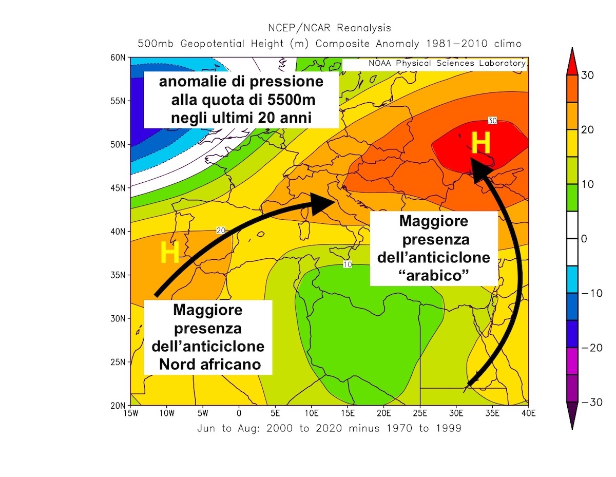 Ma le osservazioni relative agli ultimi 40 anni indicano che la Cella di Harley, a seguito del surriscaldamento del pianeta, si è spostata mediamente verso Nord di circa 2° di latitudine (circa 200-300 km). La fascia equatoriale ove convergono gli Alisei degli opposti emisferi non è l’equatore geografico (latitudine zero) bensì un equatore “virtuale” mobile noto come ITCZ (Inter Tropical Convergence Zone) perché qui gli Alisei dell’emisfero Sud si scontrano con quelli dell’emisfero Nord e da questa convergenza si innescano le correnti calde ascendenti che alimentano la cella di Hadley. Ma negli ultimi decenni la posizione della ITCZ, si è spostata verso Nord di circa 200-300 km e quindi anche la cella di Hadley e associati anticicloni si sono spostati verso Nord. Da qui le più frequenti incursioni negli anni “2000 dell’anticiclone africano verso la nostra penisola e quindi le estati molto roventi sull’Italia. Ancor più invasiva l’incursione analoga dell’anticiclone delle penisola arabica verso l’Est europeo