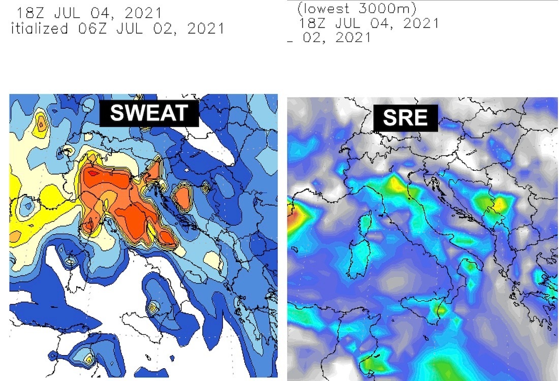 Per prevedere se e dove il 4 luglio potrebbero verificarsi trombe d’aria, abbiamo impiegato 2 indici prognostici ad hoc: l’indice SWET (Severe Weather Threath Index) e l’indice SRH (Storm Relative Helicity). La statistica dimostra che quando lo SWET assume valori oltre 350, le trombe d’aria divengono possibili, molto probabili con SWEAT oltre 450.