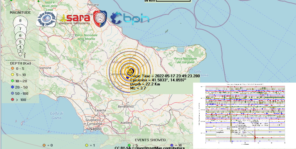 Una scossa di terremoto di Ml 3.7 è stata registrata alle ore 01:49:23 in provincia di Campobasso in Molise con ipocentro alla profondità di 22 km. I comuni più vicini all’epicentro sono stati