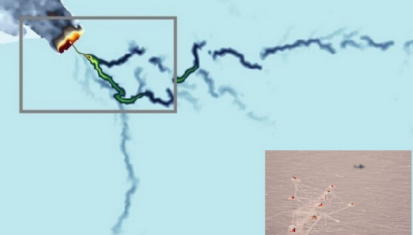 Ad esempio, il fiume appena scoperto emerge in mare sotto una banchisa di ghiaccio galleggiante e l’acqua dolce del fiume porta acqua più calda verso il fondo della banchisa di ghiaccio, sciogliendola dal basso.