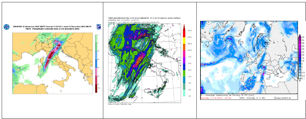 Diversi modelli di calcolo: Cosmo-Me (step del 12/11/2012 ore 00UTC cumulata 12h max segnale 155mm), Moloch-Cnr Bolam (step 12/11/2012 ore 00:00UTC cumulata 21h max segnale 150mm>200mm) e Gfs mesoscala (step del 11/11/2012 ore 18UTC cumulata 6h max segnale 25>35mm ), mostrano un forte segnale di precipitazioni molto intense e persistenti a carattere temporalesco. Il primo da sinistra prevelentemente sull’intero territorio toscano a confine con l’Umbria ad esclusione del basso Lazio Marche meridionali ed Abruzzo, il secondo e il terzo su gran parte dell’Italia centrale tranne l’Abruzzo. Nel giorno 12/11/2012 dopo la pausa tra la tarda mattinata e parte del pomeriggio, riprendono le piogge su gran parte del territorio regionale, le quali insistono per alcune ore fino a cessare in nottata. Tali immagini (Figura 13), suggeriscono che gran parte dei modelli deterministici, hanno captato correttamente le potenzialità alluvionali dell’evento.