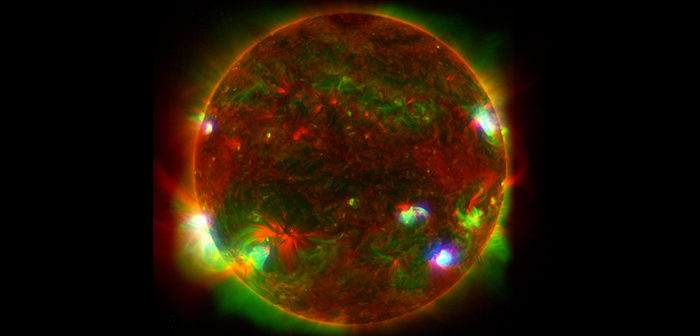 La nuova immagine mosaico di Nustar, realizzata unendo le osservazioni fatte nel giugno 2022, mostra (sotto forma di aloni blu) i raggi X ad alta energia emessi dal materiale ad alta temperatura che si pensa abbia origine quando si manifestano piu’ nanoflare l’uno vicino all’altro. Le osservazioni di Nustar consentono ora ai fisici solari di studiare la frequenza con cui queste piccole eruzioni si verificano e il modo con cui rilasciano energia.