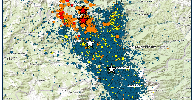 Otto anni fa, la sequenza sismica del Centro Italia, iniziata senza preavviso il 24 agosto, prendeva una piega nuova e in parte aspettata. La sismicità, che fino a quel giorno era rimasta confinata nel settore appenninico compreso tra il confine Lazio-Abruzzo e la zona poco a nord di Norcia (cerchi blu), migrava verso nord, con i due forti terremoti del 26 (M5.4 alle 19:10 e M5.9 alle 21:18) interessando un settore nuovo, fino a Muccia. La zona attiva si estendeva così per oltre 60 km dall’Abruzzo alle Marche.