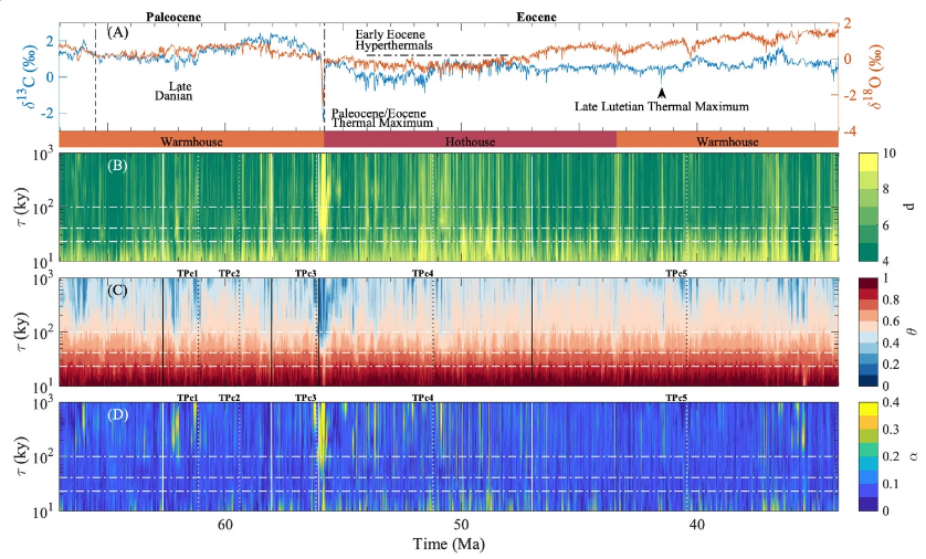 Nei pannelli (B–D), le linee verticali continue e tratteggiate indicano i Punti Critici (Tipping Points) identificati da Rousseau et al. con un’analisi separata di ciascun segnale (vengono mostrati solo quelli relativi al carbonio per chiarezza). Le linee orizzontali bianche tratteggiate e punteggiate rappresentano le principali scale temporali delle ciclicità astronomiche di Milankovitch: precessione (~20.000 anni), obliquità (~40.000 anni) ed eccentricità (~100.000 anni).