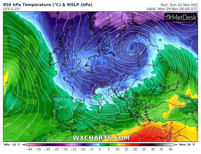 Situazione meteo alle 00Z di lunedì 29 novembre, pressione al livello del mare e temperatura a 850 hPa (WXCHARTS/GFS)