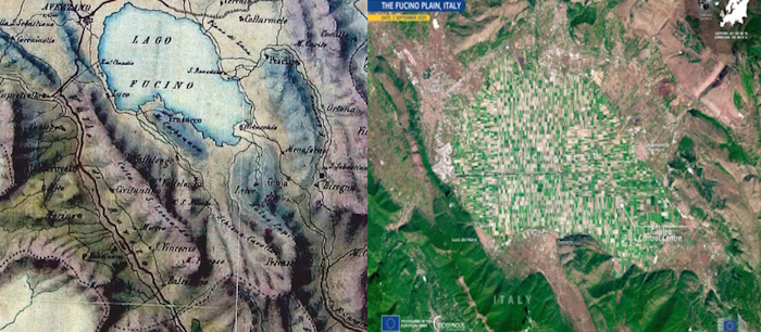 A guardarla dallo spazio, come nell’immagine catturata da uno dei satelliti Copernicus Sentinel-2, la Piana del Fucino, in Abruzzo, appare come uno schermo a bassa risoluzione, un’opera d’arte digitale composta da migliaia di pixel colorati. Ma non è un’immagine sgranata: è la fotografia di una delle trasformazioni ambientali e umane più radicali della storia d’Italia