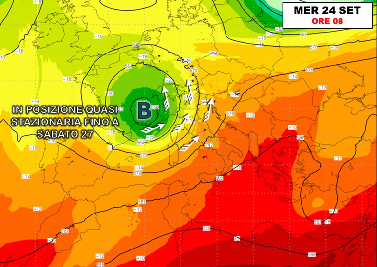 Scrivevamo proprio ieri circa le condizioni meteorologiche dei prossimi giorni che resteranno in balia della goccia fredda, nata ieri dalla saccatura nord atlantica. La struttura ciclonica, diventata ormai completamente autonoma, nella giornata di domani (mercoledรฌ 24) si posizionerร con il proprio nocciolo freddo di -22 ยฐC a 500 hPa โ cioรจ a circa 5600 metri di quota โ a ridosso delle Alpi Occidentali esponendo in questo modo le regioni settentrionali e in misura minore quelle centrali e la Sardegna alla risalita di nuclei di vorticitร e quindi a un equilibrio dello stato atmosferico che resterร improntato alla spiccata instabilitร , con rovesci e temporali sparsi che potrebbero risultare localmente intensi. Non ci saranno sostanziali variazioni almeno fino a sabato 27 settembre, dal momento che la trottola di bassa pressione si comporterร come una boccia in movimento sul tavolo da biliardo delimitato dai campi anticiclonici che la circondano e che continueranno a farlo ancora nei prossimi quattro giorni: tra le figure di alta pressione che terranno la struttura imprigionata spiccherร in particolare quella scandinava, ben strutturata a tutte le quote e con un campo di pressione al livello del mare che potrebbe raggiungere massimi barici intorno ai 1035 hPa. Si andrebbe quindi delineando una configurazione sinottica caratterizzata dalla presenza di aree anticicloniche alle alte latitudini, opposte a una circolazione che in area mediterranea potrebbe diventare piรน depressionaria almeno in quota, a partire dal fine settimana nei modi e nella forma che bisognerร analizzare nei prossimi giorni, alla luce dei nuovi aggiornamenti: la goccia fredda potrebbe infatti sboccarsi, dilatarsi ed estendere la propria influenza anche verso le regioni meridionali che risulterebbero cosรฌ piรน esposte al passaggio di precipitazioni.