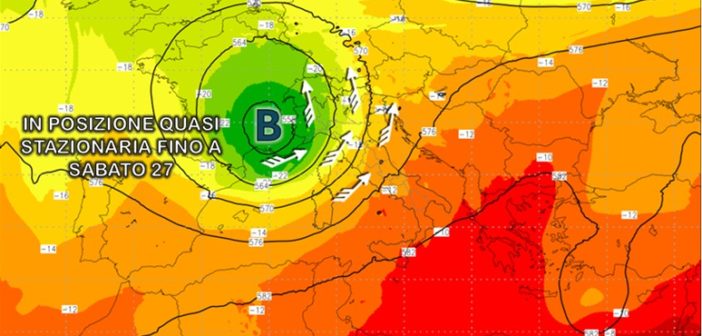Scrivevamo proprio ieri circa le condizioni meteorologiche dei prossimi giorni che resteranno in balia della goccia fredda, nata ieri dalla saccatura nord atlantica. La struttura ciclonica, diventata ormai completamente autonoma, nella giornata di domani (mercoledรฌ 24) si posizionerร con il proprio nocciolo freddo di -22 ยฐC a 500 hPa โ cioรจ a circa 5600 metri di quota โ a ridosso delle Alpi Occidentali esponendo in questo modo le regioni settentrionali e in misura minore quelle centrali e la Sardegna alla risalita di nuclei di vorticitร e quindi a un equilibrio dello stato atmosferico che resterร improntato alla spiccata instabilitร , con rovesci e temporali sparsi che potrebbero risultare localmente intensi. Non ci saranno sostanziali variazioni almeno fino a sabato 27 settembre, dal momento che la trottola di bassa pressione si comporterร come una boccia in movimento sul tavolo da biliardo delimitato dai campi anticiclonici che la circondano e che continueranno a farlo ancora nei prossimi quattro giorni: tra le figure di alta pressione che terranno la struttura imprigionata spiccherร in particolare quella scandinava, ben strutturata a tutte le quote e con un campo di pressione al livello del mare che potrebbe raggiungere massimi barici intorno ai 1035 hPa. Si andrebbe quindi delineando una configurazione sinottica caratterizzata dalla presenza di aree anticicloniche alle alte latitudini, opposte a una circolazione che in area mediterranea potrebbe diventare piรน depressionaria almeno in quota, a partire dal fine settimana nei modi e nella forma che bisognerร analizzare nei prossimi giorni, alla luce dei nuovi aggiornamenti: la goccia fredda potrebbe infatti sboccarsi, dilatarsi ed estendere la propria influenza anche verso le regioni meridionali che risulterebbero cosรฌ piรน esposte al passaggio di precipitazioni.