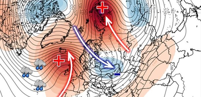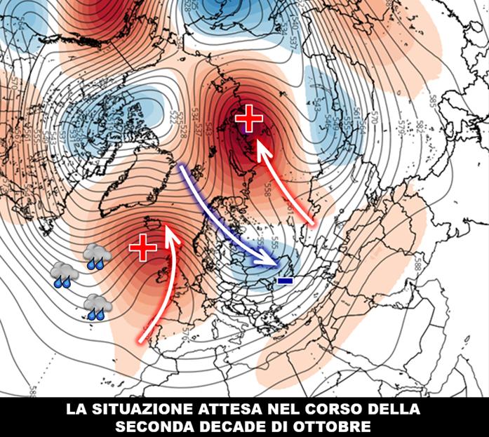 Al contrario, sono ancora le figure di alta pressione a gestire il nostro tempo e quindi a decidere quale strada lasciare libera al passaggio dei sistemi perturbati – come quello di oggi in rapida evoluzione lungo il versante adriatico – o a permettere temporanee sfuriate di aria decisamente fredda per il periodo come è accaduto negli ultimi giorni perché, occupando le alte latitudini, questi centri anticiclonici sospingono masse di aria di origine artica o polare verso paralleli più meridionali. Sarà così ancora nei prossimi giorni perché sarà ancora una figura anticiclonica a organizzare il traffico perturbato a scala sinottica. Sull’Europa occidentale, infatti, prenderà piede a partire da mercoledì 8 una configurazione di blocco a omega che farà circumnavigare le perturbazioni atlantiche attorno ad una campana anticiclonica estesa dalla penisola iberica fino all’Islanda (vedi figura). Nessun movimento ovest est, ma una traslazione meridiana dei sistemi nuvolosi che poi si presenteranno sul settore centro-orientale europeo guidati da correnti settentrionali e che potrebbero parzialmente coinvolgere anche la nostra penisola, magari apportando condizioni di variabilità o instabilità specie sui versanti orientali, stante probabilmente l’Italia ai margini della struttura anticiclonica. Andremo quindi incontro ad una fase meteorologica in cui la presenza di strutture di alta pressione alle alte latitudini atlantiche non potrà in alcun modo favorire quell’attività ciclonica di cui abbiamo prima parlato e che è indispensabile per l’avvio della nuova stagione sotto diversi aspetti.Quello più importante è il carico nevoso sulle Alpi: è l’autunno, per eccellenza, la stagione delle nevicate utili per i ghiacciai (che sono rimasti) e per le alte quote in generale, sopra i 1500-2000 metri. È l’autunno la stagione perché è proprio in questo periodo dell’anno che l’ingresso delle perturbazioni dalla porta occidentale richiama correnti meridionali che garantiscono la caduta abbondante e diffusa di fiocchi pesanti in atmosfera non ancora particolarmente fredda. Ma se la porta da ovest è chiusa, l’atmosfera non è in grado di porre rimedio in altro modo e tocca ancora aspettare l’evoluzione degli eventi sperando magari i tasselli di questo intricato e complesso puzzle vadano a posto, senza comunque averne la garanzia. Durante questa attesa, sperando che non sia vana, possono poi anche passare perturbazioni per vie secondarie, possono arrivare correnti più fredde che ci fanno temporaneamente vivere giornate da novembre inoltrato ma sono solo illusioni di una stagione che ancora stenta a decollare sotto la guida di chi avrebbe tutto il diritto di guidarla. Tutto il resto è altro. A tutti voi un abbraccio e un augurio di buona settimana.