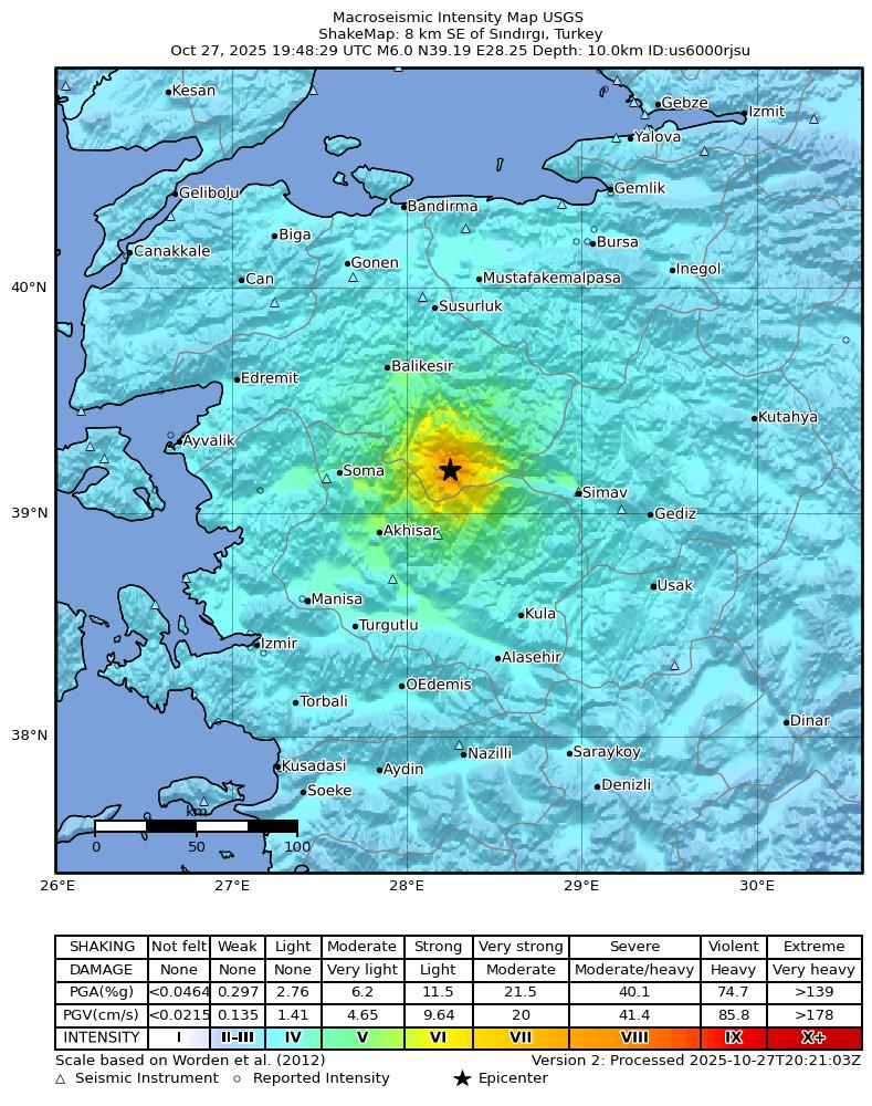 L’epicentro è stato localizzato 4 km a SE of Sındırgı, nella provincia di Balıkesir. Ci sono danni a cose e persone, si temono vittime, evento avvertito dalla popolazione anche in molte località della Turchia