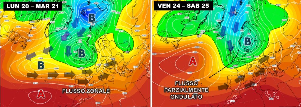 Un tentativo di normalitร nel governo dello stato del tempo prenderร forma nei prossimi giorni, quando le correnti atlantiche riusciranno ad entrare sul bacino del Mediterraneo grazie a un abbassamento di latitudine del flusso perturbato che assumerร un moto di direzione prettamente zonale, cioรจ orientato da ovest verso est. La distribuzione dei centri di alta e di bassa pressione sarร infatti impostato lungo i paralleli e trasporterร verso le nostre regioni una massa dโaria umida e temperata che sarร sollecitata a salire di quota e a condensare in nubi e precipitazioni con il prevalente aiuto delle catene montuose che formano lโorografia della nostra penisola: non ci troveremo quindi di fronte a precipitazioni in cui vedremo in azione anche gli effetti dinamici di una circolazione depressionaria ben sviluppata a tutte le quote, ma a fenomeni indotti soprattutto dallo sbarramento a cui i rilievi esporranno questo flusso umido (stau).