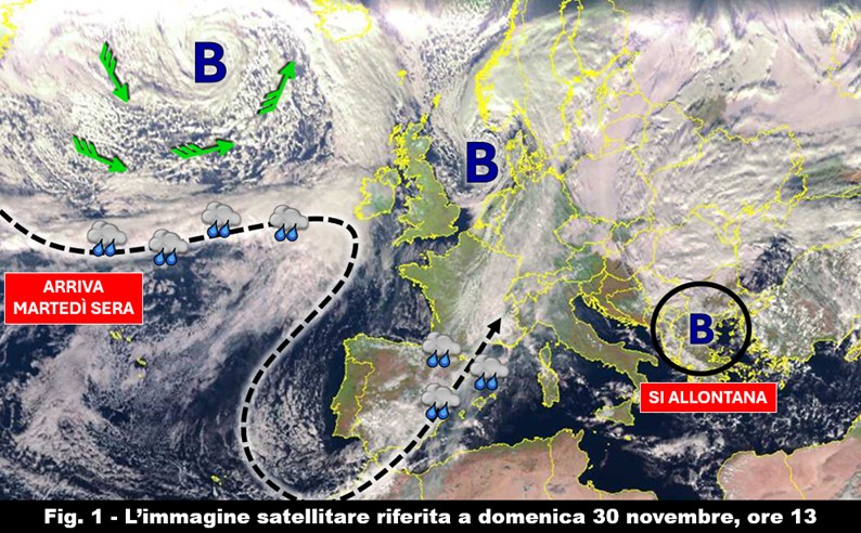 L’immagine satellitare ci permette, come sempre, di osservare il tempo in atto sull’Italia e di avere uno sguardo di insieme delle condizioni meteorologiche sul nostro continente e sul vicino Oceano Atlantico (fig. 1).