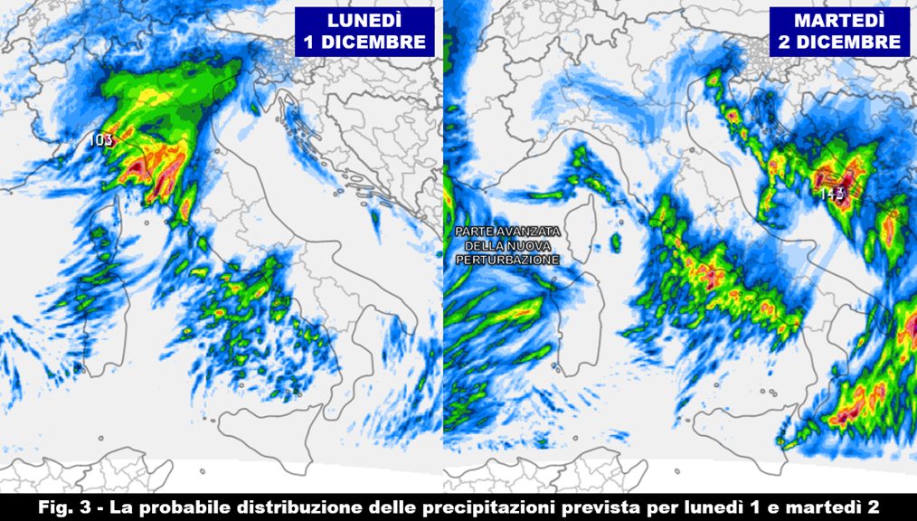 Per il momento, entro le prossime 48 ore saremo interessati dal passaggio del primo impulso che porterà precipitazioni da sparse a diffuse sul settore centro-orientale del Nord, sul Levante Ligure e sulla Toscana (fig. 3): su questi ultimi settori le cumulate potrebbero risultare localmente significative nella giornata di domani (lunedì 1) a causa di probabili rovesci forti generati da nubi anche temporalesche. Deboli ed intermittenti nevicate sull’arco alpino, specie sul settore centro-orientale, oltre i 1000-1300 metri. Le precipitazioni si presenteranno invece in forma più isolata sul restante versante tirrenico specie tra il Lazio e la Campania, dove i fenomeni dovrebbero concentrarsi in forma più organizzata in particolar modo lungo le aree costiere e l’immediato entroterra specie nella giornata di martedì 2. Qualche pioggia in arrivo anche in Sardegna che inizierà a risentire degli effetti della nuova perturbazione atlantica già dalla serata di martedì.