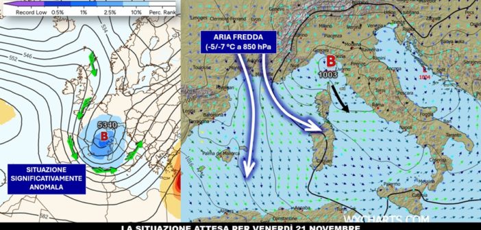 Nelle ultime analisi abbiamo seguito, ricalcolo dopo ricalcolo, la posizione della depressione che è prevista formarsi sul nostro bacino del Mediterraneo tra giovedì e venerdì. Una situazione che andrà sviluppandosi in seno alla discesa di una saccatura ricolma di aria artica marittima che porterà il proprio minimo in quota tra le Alpi Occidentali, il Golfo del Leone e il Golfo Ligure entro le prossime 48-72 ore e che estenderà la propria fin sull’entroterra nord africano. La superficie isobarica di 500 hPa si posizionerà a quote decisamente basse per il periodo, raggiungendo all’incirca i 5300 metri proprio laddove la depressione in quota si accompagnerà al nucleo più freddo della massa d’aria che presenterà una temperatura, sempre a 500 hPa, tra -34 e -36 °C proprio allo sbocco della Valle del Rodano: secondo la climatologia, si tratterebbe di una situazione decisamente fredda per il periodo, tanto che l’anomalia è prevista scendere anche al di sotto del secondo percentile.