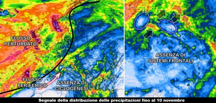 A corredo dell’articolo pubblicato ieri, ecco la proiezione del segnale piovoso calcolato dalla modellistica numerica e valido per i prossimi dieci giorni, fino alla fine della prima decade di novembre. Non è una previsione da intendere in senso stretto per ovvi motivi legati alla predicibilità dell’atmosfera, ma è un modo per cogliere meglio l’assenza di una dinamica autunnale degna di tale nome sul bacino del Mediterraneo. Lungo quella linea nera scorre all’incirca il confine entro il quale si estende il raggio d’azione del flusso perturbato atlantico mentre al di sotto di essa la circolazione periferica, che fa da cerniera con le correnti a componente anticiclonica presenti più a sud, trasporta solo aria umida che rilascia precipitazioni più organizzate solo laddove il flusso interagisce con l’orografia della nostra penisola.