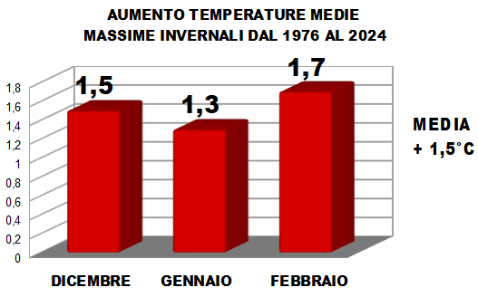 Se andiamo ad analizzare le temperature medie invernali degli ultimi 50 anni scopriamo che, nei mesi cruciali dell’inverno per le nevicate, che sono dicembre, gennaio e febbraio, le temperature in media sono aumentate di 1.5°C. Cosa comporta questo aumento, per quello che concerne le nevicate?