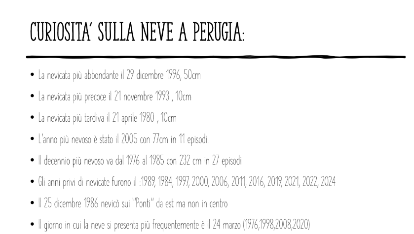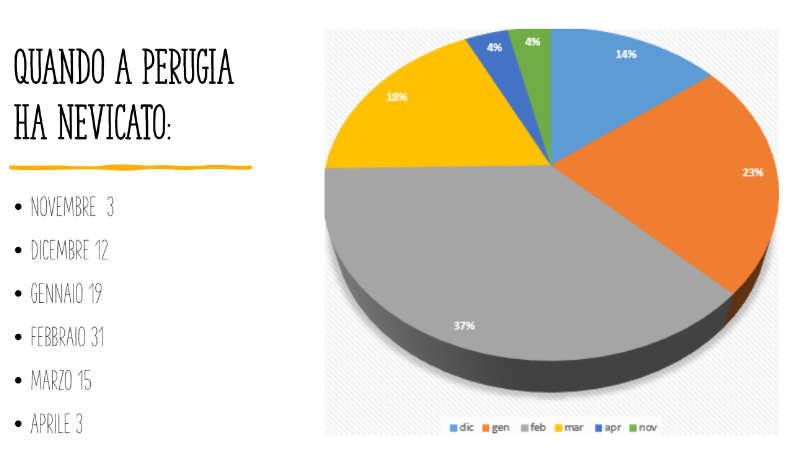 Per finire questa analisi, è molto interessante scoprire che il giorno in cui si è più presentata la neve a Perugia, non fa parte della stagione invernale, ma della primavere, ed è il 24 marzo. Invece, fatto questo che conferma la tendenza ad un innalzamento della temperatura nei mesi invernali, è che gli anni senza nevicate sono 11, di cui 8 nel terzo millennio e ben 5 negli ultimi 10 anni