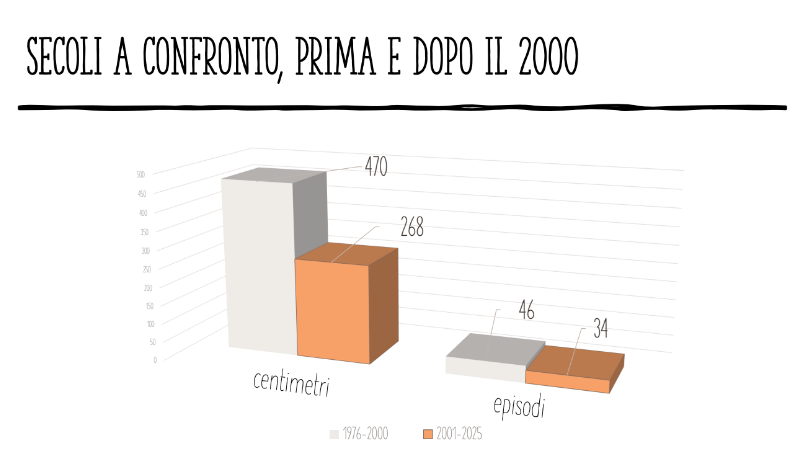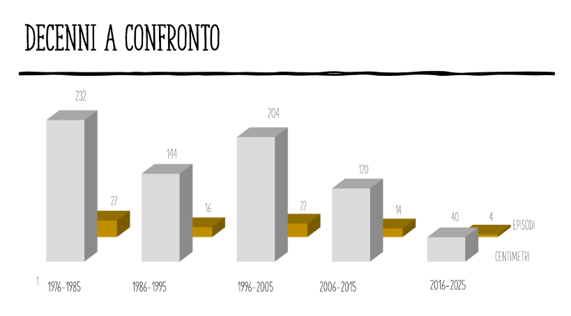 Ma il calo delle nevicate a Perugia, diventa ancora più macroscopico dividendo il periodo dei 50 anni del Diario, nei 25 finali del 20esimo secolo, e nei primi 25 del terzo millennio, dove la diminuzione è palese, sia nel quantitativo di cm caduti ma, soprattutto, nel numero degli episodi: solo 34 negli ultimi 25 anni, in confronto dei 268 del periodo 1976-2000