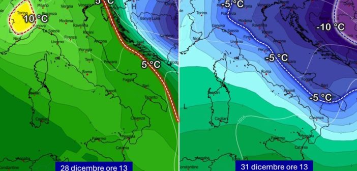 Una toccata e fuga. Sarà questa la caratteristica del raffreddamento previsto a cavallo del nuovo anno a seguito, come detto, della discesa verso l’Europa centro-orientale di una massa d’aria di origine artica che riuscirà temporaneamente a propagarsi anche verso l’Italia passando dalla penisola balcanica (fig. 1). Il netto cambio di passo rispetto alla situazione attuale è ben evidente dal confronto tra il campo termico a 850 hPa che avremo nel primo pomeriggio odierno e quello previsto per mercoledì 31: in settantadue ore passeremo dagli attuali 6-10 °C a temperature inferiori a 0 °C, con l’isoterma di -5 °C che scorrerà per qualche ora lungo il crinale appenninico passando dalle Alpi centrali e valori prossimi a -7/-8 °C in veloce evoluzione alla stessa quota sul Nord-Est.