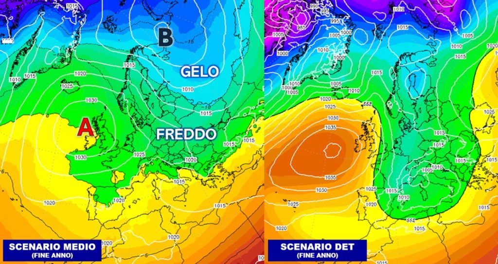 Infatti, la presenza di una massa d’aria fredda a 850 hPa in una posizione più vicina all’Italia – da intendere anche in questo caso come segnale dominante – deriverebbe proprio dallo spostamento più a ovest dei massimi di pressione a tutte le quote rispetto alla posizione che andrà a assumere la figura anticiclonica nei giorni intorno a Natale. Questo scenario medio è composto da un ventaglio di cinquanta scenari che hanno tutti lo stesso comune denominatore: il segnale anticiclonico in area atlantica. A fare la differenza tra una soluzione e l’altra sono la forma, l’estensione e la potenza della figura di alta pressione da cui dipenderanno, come in un effetto a cascata, anche l’intensità e la traiettoria delle irruzioni di aria fredda. Per esempio, lo scenario deterministico a cui si fa riferimento nella figura a destra rientra a pieno titolo tra le possibili evoluzioni alla mesoscala che potrebbero scaturire proprio da questa configurazione barica dettata dal blocco anticiclonico in Oceano.