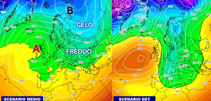 Infatti, la presenza di una massa d’aria fredda a 850 hPa in una posizione più vicina all’Italia – da intendere anche in questo caso come segnale dominante – deriverebbe proprio dallo spostamento più a ovest dei massimi di pressione a tutte le quote rispetto alla posizione che andrà a assumere la figura anticiclonica nei giorni intorno a Natale. Questo scenario medio è composto da un ventaglio di cinquanta scenari che hanno tutti lo stesso comune denominatore: il segnale anticiclonico in area atlantica. A fare la differenza tra una soluzione e l’altra sono la forma, l’estensione e la potenza della figura di alta pressione da cui dipenderanno, come in un effetto a cascata, anche l’intensità e la traiettoria delle irruzioni di aria fredda. Per esempio, lo scenario deterministico a cui si fa riferimento nella figura a destra rientra a pieno titolo tra le possibili evoluzioni alla mesoscala che potrebbero scaturire proprio da questa configurazione barica dettata dal blocco anticiclonico in Oceano.
