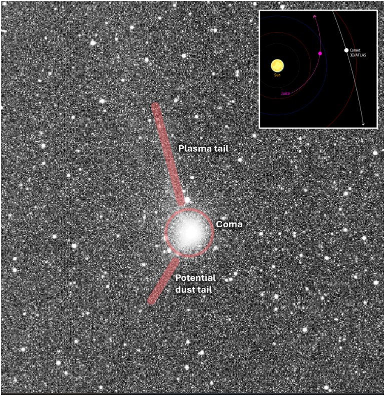 Inoltre, Juice ha fotografato la cometa con la sua telecamera di navigazione di bordo (NavCam), progettata non come una telecamera scientifica ad alta risoluzione, ma per aiutare Juice a navigare tra le lune ghiacciate di Giove dopo l’arrivo nel 2031.