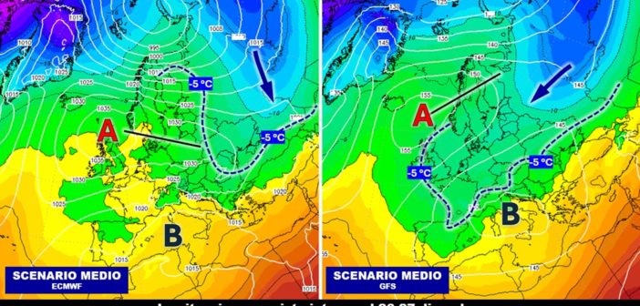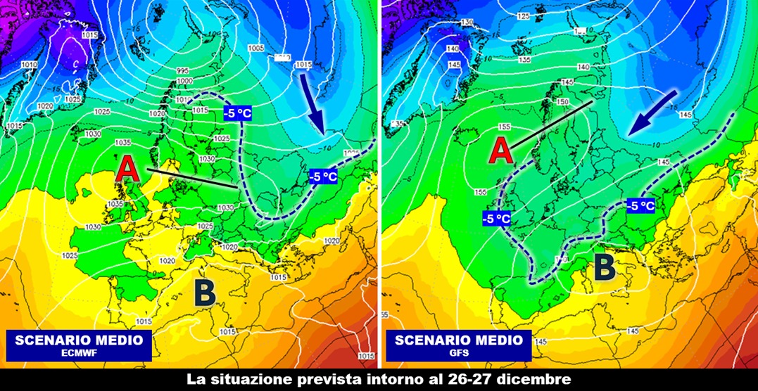 Questo aspetto, che è fondamentale per avere un’idea delle condizioni meteorologiche che potrebbero verificarsi negli ultimi giorni di dicembre, ci viene oggi mostrato molto bene negli ultimi aggiornamenti proposti per esempio dai due principali modelli numerici che si occupano di simulare il futuro stato del tempo a grande scala. Siamo intorno al 26-27 dicembre, cioè nel momento in cui i due ingranaggi anticiclonico e ciclonico dovrebbero iniziare ad attivare quel gradiente barico necessario per l’innesco di un’irruzione. Focalizzando l’attenzione sulla posizione media dell’isoterma di -5 °C a 850 hPa è evidente come la diversa inclinazione dell’asse principale del campo di alta pressione – indicato in figura dalla linea nera – vada proprio a condizionare in modo determinante l’orientamento del flusso verso ovest o verso est a seconda che la struttura anticiclonica si corichi rispettivamente lungo i paralleli europei o si orienti verso la penisola scandinava.