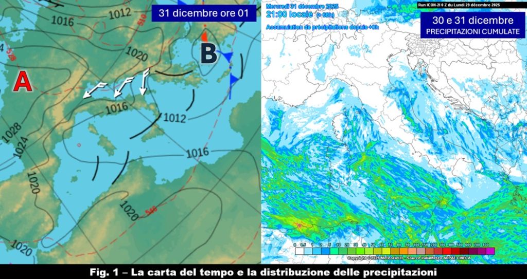 Sarà appena un sussulto invernale ma si farà certamente sentire dal punto di vista termico perché, anche se non arriveranno isoterme in quota tipiche di un’ondata di gelo, saranno comunque basse specie al Nord e lungo il versante adriatico dove, proprio nella mattina di mercoledì 31 e cioè quando si raggiungerà l’apice dell’irruzione, a circa 1500 metri si avranno valori per lo più compresi tra -4 e -7 °C. L’arrivo della massa d’aria artica sarà preceduto da una breve fase instabile molto disorganizzata, dal momento che non sarà sostenuta da una figura di bassa pressione ma appena da un’accennata curvatura ciclonica che risulterà un po’ più pronunciata sulle regioni meridionali, più vicine al minimo in probabile formazione sul Mare Egeo (fig. 1, a sinistra).