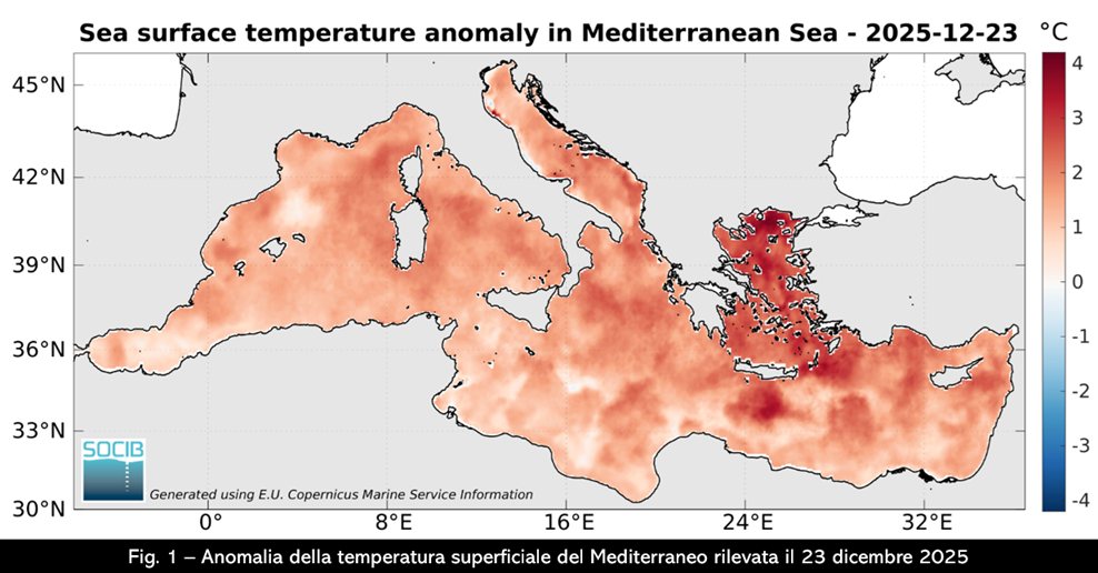Paghiamo la persistenza di uno stato atmosferico che rimane vestito di autunno e che quindi porta con sé quelle condizioni meteorologiche che sono ancora tipiche della stagione passata: le precipitazioni abbondanti già registrate e quelle attese per esempio anche tra oggi e domani su alcune delle nostre regioni ne sono l’espressione più lampante. In effetti, siamo interessati da una vasta circolazione ciclonica che si è insediata sul Mediterraneo e che quindi produce nubi e precipitazioni. Nel circolo, però, entra anche parte del calore sottratto a una superficie marina che su tutto il bacino continua a mantenere una temperatura superiore alla media di 1-2 °C rispetto alla climatologia dell’ultimo trentennio (fig. 1).