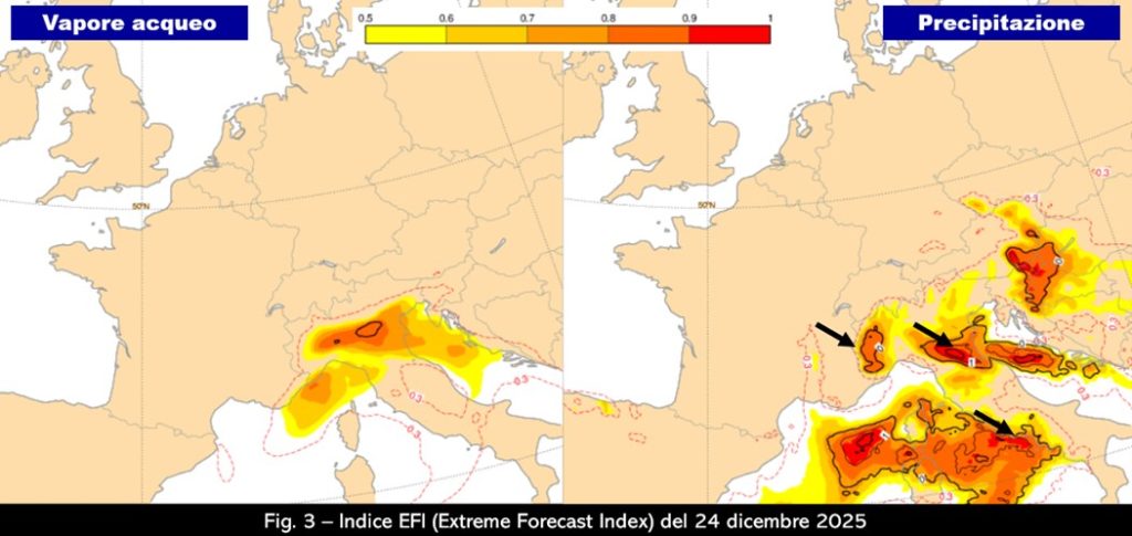 Di conseguenza, aumentano anche i flussi di vapore acqueo che la medesima struttura ciclonica mette in movimento fino a quando questi non intercettano una barriera montuosa e si trasformano in precipitazioni che risultano abbondanti proprio perché è abbondante il contenuto di vapore in una colonna atmosferica che è più calda rispetto alle condizioni termiche che dovremmo avere in questo periodo. Si sa che l’aria calda contiene più vapore acqueo di una massa uguale di aria fredda e quindi il cerchio si chiude. A proposito di flussi di vapore acqueo e di precipitazioni, l’Extreme Forecast Index (EFI) di questi giorni mostra proprio come nella giostra ciclonica mediterranea si muovano correnti che sono molto più umide rispetto alle condizioni tipiche del periodo (figg. 1 e 2): valori dell’indice superiori a 0.7, fino a raggiungere l’unità, danno indicazioni su quanto siano insolite le condizioni che si stanno verificando, fino a essere considerate potenzialmente eccezionali.