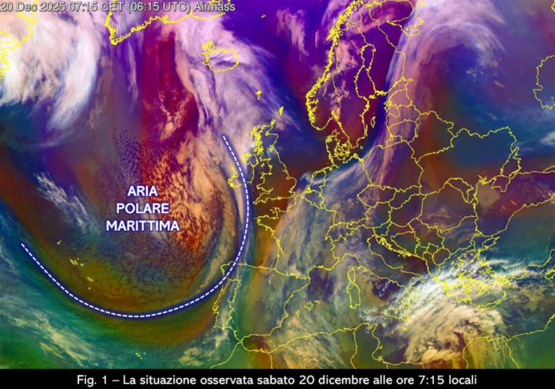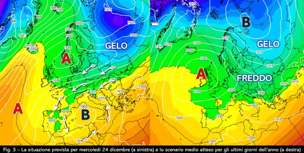 La perturbazione non riuscirà a interessare tutte le nostre regioni perché, ancora una volta, non avrà la spinta necessaria per evolvere verso levante. La saccatura che la accompagnerà sarà infatti recisa da una possente rimonta anticiclonica di matrice azzorriana che andrà a congiungersi con un’analoga figura di alta pressione formatasi nel frattempo sulla penisola scandinava. Dalla coda della saccatura si isolerà così una circolazione depressionaria autonoma che proprio nei giorni intorno al Natale condizionerà il tempo dell’Italia agendo in sinergia con il blocco anticiclonico (fig. 3, a sinistra). I due ingranaggi piloteranno così la parte più intensa dell’irruzione di aria fredda verso l’Europa centro-orientale ma riusciranno comunque a convogliare una minima parte del flusso freddo periferico anche verso ovest facendolo transitare soprattutto a nord dell’arco alpino fino a raggiungere la Francia: per i dettagli, bisognerà valutare se e quanta aria fredda appartenente a questo flusso periferico riuscirà a percorrere le valli alpine per raggiungere anche la Pianura Padana. La configurazione di blocco continuerà probabilmente a organizzare le dinamiche della circolazione atmosferica a scala europea anche negli ultimi giorni del mese (fig. 3, a destra).