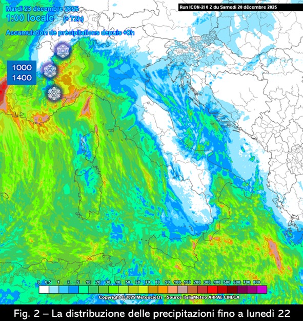 Altrove sono invece presenti condizioni di variabilità che da domani lasceranno il posto a un nuovo cambiamento dello stato del tempo. Come è infatti ben visibile dall’immagine satellitare di questa mattina, una vasta e profonda saccatura ricolma di aria fredda polare marittima si sta avvinando all’Europa sud-occidentale e con la propria parte più avanzata raggiungerà le Isole Baleari nella notte tra domenica e lunedì accompagnando così l’ingresso di una nuova perturbazione.Anche in questo caso il sistema sarà preceduto da correnti sciroccali e almeno in una prima fase limiterà la propria influenza alle regioni occidentali italiane dove, tra domani e lunedì, andranno a concentrarsi le precipitazioni (fig. 2): in particolare, sarà ancora il Nord-Ovest a risentire dei fenomeni più organizzati grazie anche al sollevamento orografico che dispenserà cumulate anche significative – nevose in genere oltre i 1000-1400 metri – specie sul Piemonte e sul Ponente Ligure. Poco o nulla invece sul resto della penisola, con il settore alpino del Nord-Est e l’area appenninica che si troveranno ancora in condizioni di pesante deficit nivometrico.