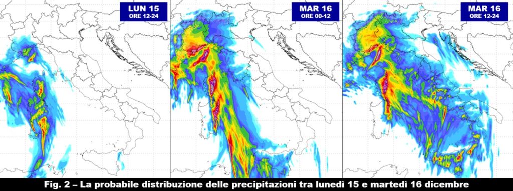 Poi, nel corso di martedì, le precipitazioni si estenderanno a tutto il Piemonte, alla Lombardia, all’Emilia e al versante tirrenico, fino alla Sicilia e continueranno a interessare anche l’isola sarda, dove saranno probabili anche dei temporali (fig. 2, al centro e a destra). Le cumulate più abbondanti, però, si concentreranno al Nord-Ovest (in particolare tra basso Piemonte e Ponente Ligure) e sulla costa orientale della Sardegna perché qui saranno massimi gli effetti del sollevamento forzato dai rilievi a cui sarà sottoposto il flusso umido sciroccale. In forma più puntuale, piogge a tratti intense anche a carattere temporalesco si potrebbero verificare anche sulla Sicilia e sul reggino ionico. Altrove, invece, i fenomeni tenderanno a essere sempre meno organizzati e ad assumere carattere di intermittenza man mano che ci sposteremo verso levante, fino ad essere poco probabili o del tutto assenti tra la Romagna e le regioni di Nord-Est.Nevicate sull’arco alpino centro-occidentale oltre i 1000-1400 metri, a quote inferiori solo sul cuneese e sull’estremo entroterra del Ponente Ligure dove la neve potrebbe spingersi fin verso i 600-700 metri. Mercoledì la perturbazione farà ancora qualche passo in avanti, ma nel frattempo si sarà indebolita e si limiterà probabilmente a portare qualche pioggia soprattutto sul Nord-Est, sull’Emilia Romagna e sulle regioni centro-meridionali.