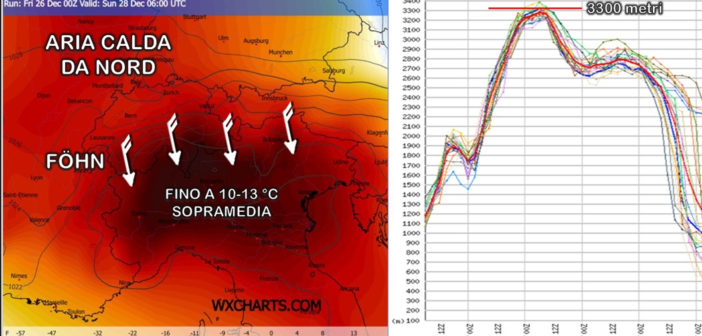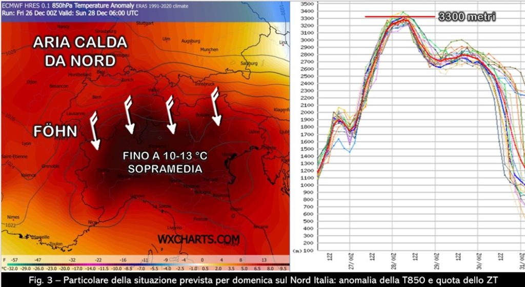 Almeno in una prima fase, però, l’aria in arrivo alle nostre latitudini sarà quella che sta attualmente stazionando sulla penisola scandinava, vale a dire una massa d’aria che è calda già in partenza e che, per questioni dinamiche, sarà costretta ad impattare sull’arco alpino per dar luogo a venti di föhn sul versante sottovento: la compressione adiabatica a cui andrà incontro la riscalderà ulteriormente, facendo così superare – sempre per quanto riguarda la temperatura a 850 hPa – quel 99° percentile rispetto alla nostra climatologia di riferimento proprio sull’arco alpino e sulle regioni settentrionali. Soffermandoci su due particolari di questa evoluzione (fig. 3), è curioso far notare come l’episodio favonico coinvolgerà una massa d’aria che a nord dell’arco alpino avrà già una temperatura a circa 1500 metri tra 5 e 8 °C sopra la media e che poi, sul nostro versante, si porterà fino a 10-13 °C sopra la media climatologica di fine dicembre causando di pari passo anche un drastico aumento della quota dello zero termico che supererà i 3000 metri proprio nella giornata di domenica.