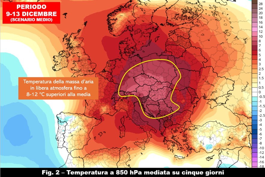 Nel corso di questa settimana saremo interessati da una massa d’aria che, a circa 1500 metri di quota, avrà una temperatura fino a 8-12 °C superiori alla media climatologica tra il settore alpino e i paesi europei centro-orientali e balcanici (fig. 2): come spesso accade in queste situazioni, saranno quindi le aree montuose a risentire maggiormente degli effetti dell’anomala circolazione atmosferica con lo zero termico che si porterà tra i 3000 e i 3500 metri, cioè ad una quota che per le Alpi è tipica del periodo estivo.Anomalie delle temperature nel complesso più contenute nei bassi strati, fino a 3-6 °C, renderanno invece meno avvertita dalla popolazione questa situazione decisamente fuori stagione dal punto di vista sinottico.