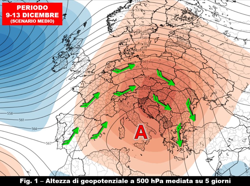 Ci aspetta un periodo di stallo che durerà almeno fino alla prima metà della prossima settimana. Con l’arrivo del promontorio nord africano si è infatti aperta una fase meteorologica dominata dalla stabilità atmosferica e da temperature che si manterranno al di sopra dei valori tipici di dicembre. È ormai noto però che nella stagione invernale la presenza di questa figura barica non sempre è sinonimo di cielo sereno ovunque per via della formazione di nebbie e di nubi basse che si fanno strada all’interno dello strato di inversione termica che è a contatto con il suolo e che è sormontato da una massa d’aria decisamente mite, di origine subtropicale, responsabile proprio del rigonfiamento delle superfici isobariche che fanno assumere al campo anticiclonico la tipica forma a campana (fig. 1).