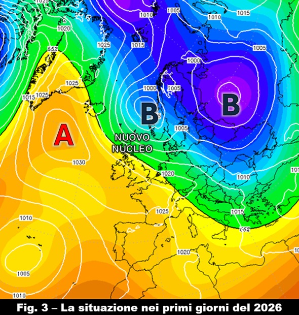A cavallo del nuovo anno questa variazione del campo termico sarà probabilmente accompagnata anche dall’incremento delle condizioni di instabilità che dovrebbero presentarsi in forma più accentuata sulle regioni centro-meridionali dove, con l’abbassamento anche della quota dello zero termico, potrebbero verificarsi sporadiche precipitazioni nevose a quote via via più basse in Appennino: per il momento diamo credito a questa possibilità e ci riserviamo di ritornare su questo dettaglio previsionale nei prossimi giorni. L’evoluzione attesa poi per i primi giorni del nuovo anno dipenderà dall’evoluzione di una nuova depressione che entrerà sotto il raggio d’azione della più vasta circolazione ciclonica presente sulla Russia. L’ingresso di un nuovo nucleo freddo, in evoluzione dall’est della Groenlandia verso il Mare del Nord tra giovedì 1 e sabato 3 gennaio, andrà probabilmente a ridistribuire gli equilibri barici spostando ulteriormente il dominio anticiclonico atlantico verso ovest e facendo indietreggiare di pari passo anche la vasta ruota depressionaria che potrebbe andare a collocare il proprio asse lungo i meridiani passanti per la nostra penisola (fig. 3).