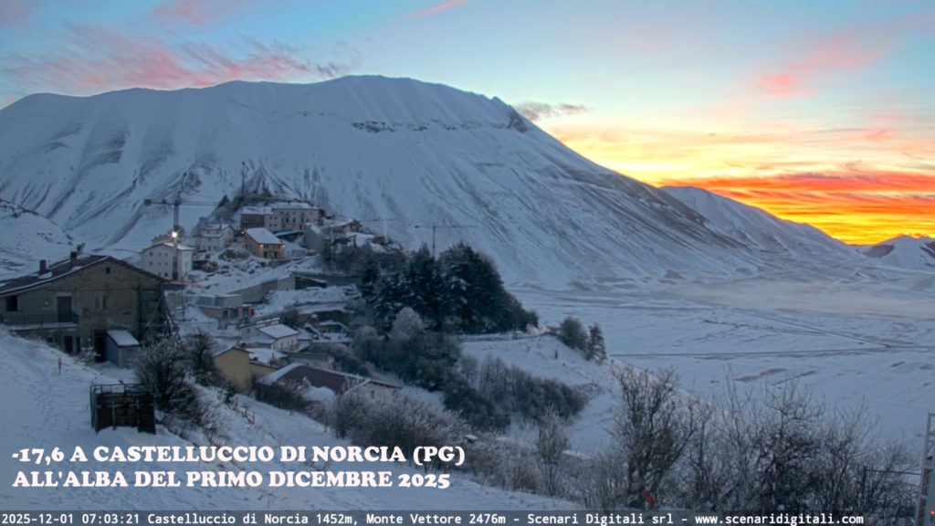 In questa situazione altalenante, a partire dal 29 novembre fino al 5 dicembre, una zona dell’appennino umbro, molto famosa per lo scenario mozzafiato che la caratterizza, che sarebbe l’Altopiano di Castelluccio di Norcia (PG) in Umbria, ha vissuto una settimana con temperature che si sono sempre mantenute al di sotto dello zero, che in meteorologia significano 7 giorni di ghiaccio. La giornata di ghiaccio si differenzia da quella di gelo, in quanto, la condizione della seconda denominazione, è che le minime scendano sotto gli 0°C ma che le massime possano stare in territorio positivo