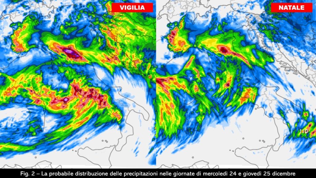 Inserita in un contesto instabile e a tratti perturbato governato dal minimo di 1005 hPa previsto posizionarsi al livello del mare tra la Sardegna e il medio Tirreno, questa modesta irruzione comporterà sulle regioni settentrionali un abbassamento dell’altezza dello zero termico e quindi del limite delle nevicate, specie laddove le precipitazioni risulteranno organizzate e persistenti e funzioneranno così da viatico per trasportare verso il basso l’aria fredda presente alle quote superiori. Ci attendono quindi due giornate – quella della Vigilia e la prima parte di quella di Natale – all’insegna del tempo instabile e a tratti perturbato, con piogge che impegneranno soprattutto il Centro-Nord, la Sardegna e la Campania, mentre risulteranno più isolate sulle restanti regioni meridionali (fig. 2).