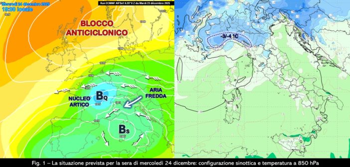 Nelle ultime ore si è andato completando l’isolamento di una circolazione depressionaria sui mari occidentali dell’Italia e l’affermazione di un vasto e robusto campo anticiclonico esteso dall’Oceano Atlantico alla penisola scandinava. La configurazione sinottica ha cambiato così le proprie caratteristiche e si avvia a mantenere per qualche giorno lo stesso tipo di tempo nelle aree interessate da queste rispettive figure bariche che rallenteranno di molto la propria evoluzione trovandosi sostanzialmente bloccate (fig. 1, a sinistra). In questo disegno andrà inoltre inserendosi il moto retrogrado di un nucleo di aria artica che nelle prossime 48 ore scivolerà lungo il fianco orientale dell’alta pressione scandinava per dirigersi verso la Francia entro la sera di domani, mercoledì 24 dicembre.