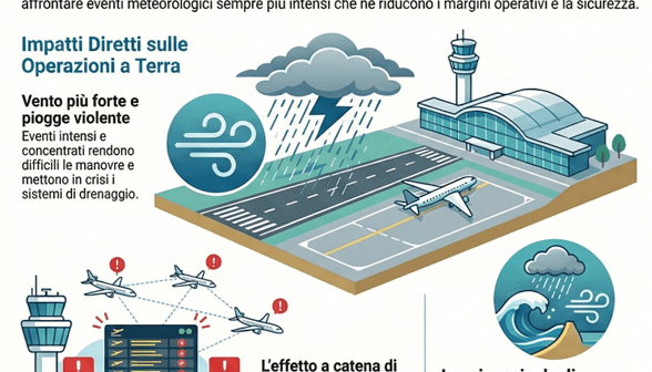 Questo aspetto riguarda soprattutto ciò che accade in quota. Tuttavia, lo stesso contesto climatico che contribuisce a rendere il volo più “mosso” è responsabile anche di una maggiore instabilità nei bassi strati dell’atmosfera, dove si svolgono le operazioni aeroportuali. Vento più intenso al suolo, precipitazioni violente e rapide variazioni delle condizioni meteo rendono più complessa la gestione delle infrastrutture a terra.