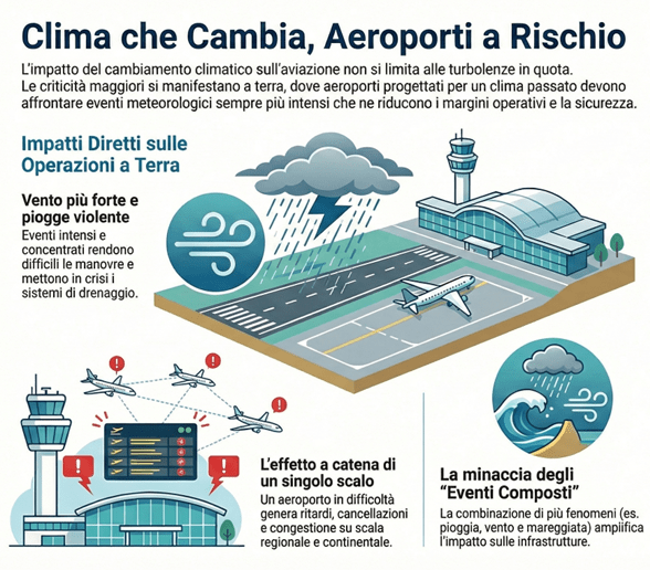 Per un aeroporto situato in pianura o in prossimità della costa, questo significa dover affrontare condizioni che superano la logica dell’evento isolato. Anche infrastrutture progettate per resistere a singoli stress possono trovarsi in difficoltà quando più sollecitazioni si sovrappongono.