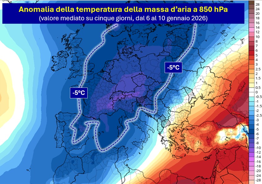 Abbiamo sperimentato il veloce passaggio dell’azione periferica di un’intensa irruzione di origine artica che ha interessato soprattutto l’area balcanica e l’est europeo e ci apprestiamo ora a sperimentare una situazione che, entro la fine della prima decade di gennaio, vedrà proprio il Mediterraneo centro-occidentale come obiettivo di una fase atmosferica dalle caratteristiche prettamente invernali, con temperature che si porteranno di diversi gradi al di sotto della media del periodo: in figura, è evidenziata per l’esempio la demarcazione che indica un’anomalia negativa di 5 °C della massa d’aria, mediata sul periodo dal 6 al 10 gennaio. Tutto ciò accadrà a causa di un ultimo tassello di questo intricato mosaico che andrà a incastrarsi nel posto giusto e al momento giusto, vale a dire di una figura depressionaria che entrerà sul palcoscenico mediterraneo da ovest proprio quando l’aria fredda si sarà ormai propagata su tutta l’Europa, fino ad addossarsi all’arco alpino e aspettare l’ultimo traghettatore per compiere il passo decisivo verso sud. Ci sono volute tre settimane per chiudere il cerchio, a dimostrazione di quanto siano davvero complesse le dinamiche di un mondo a cui ogni giorno ci avviciniamo con curiosità e desiderio di conoscenza. È questa, cari amici, la meteorologia: è la storia di un percorso fatto di mille peripezie e di altrettante strade che si intrecciano, si sovrappongono, si allontanano e poi tornano a incontrarsi seguendo i piani caotici dell’atmosfera.
