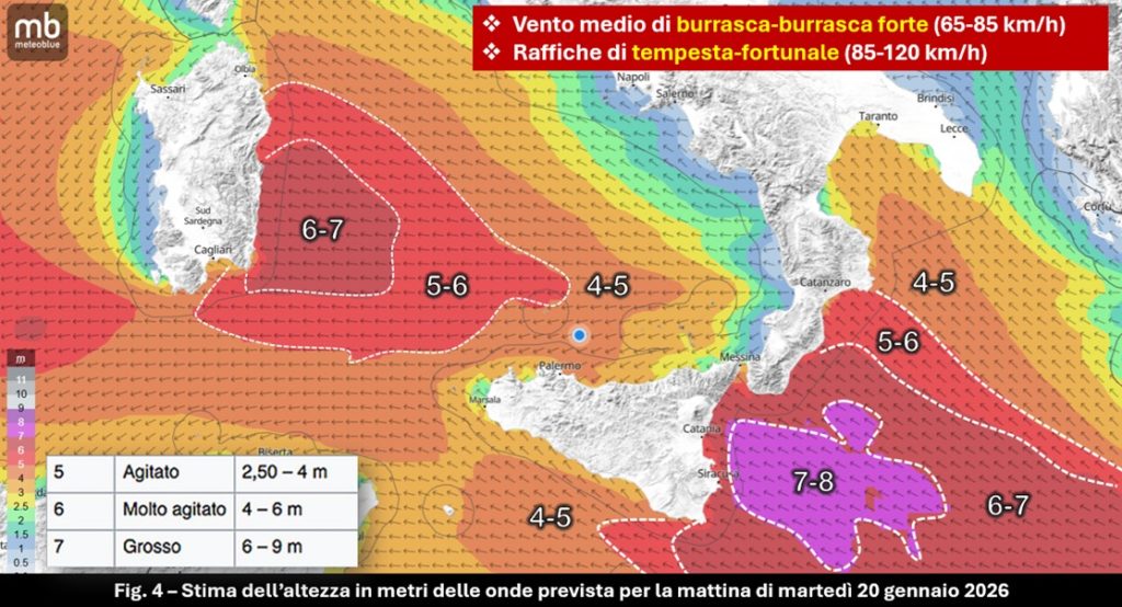 Un parziale aiuto al fenomeno del ruscellamento potrà essere dato dalla quota neve, prevista abbassarsi intorno ai 900-1200 metri sui rilievi della Calabria nel corso di martedì: resterà invece a quote medio-alte altrove e permetterà comunque la probabile caduta di ingenti accumuli nevosi sull’Etna, anche intorno ai due metri. L’intensa ventilazione avrà anche a disposizione un lungo tratto della superficie marina, libero da ostacoli, su cui soffiare per sollevare il moto ondoso. Questo fenomeno, chiamato «fetch», porterà così a uno stato del mare tra molto agitato e grosso proprio a ridosso delle coste che si troveranno sopravvento alla ventilazione e che quindi saranno esposte a mareggiate che potrebbero essere anche violente. Le onde avranno infatti la tipica caratteristica delle forti mareggiate che si possono sviluppare sul Mediterraneo durante le forti ondate di maltempo, con altezza d’onda media tra 5 e 8 metri e periodo d’onda intorno ai dieci secondi che rappresenta un valore tipico riscontrabile nel moto ondoso degli oceani (fig. 4).